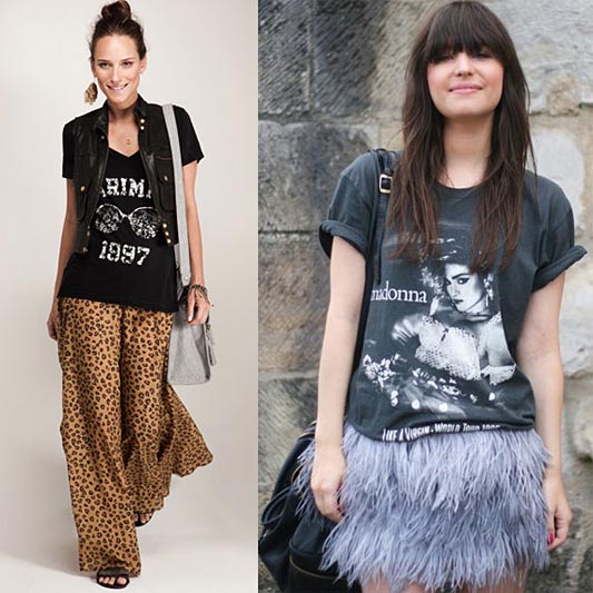 Outra aposta para usar com a t-shirt são as saias longas, ideais para as mais fashions e que gostam de ousar no visual. Com elementos da década de 70, como as franjas em aplicações, as produções com saias valorizam a feminilidade e fazem um contraponto com a simplicidade das t-shirts em certos casos.