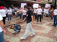 Um evento realizado na manhã deste sábado, 6 de março, no Calçadão da Halfeld, marcou o início das comemorações do mês da mulher em Juiz de Fora. Quem passou pela via, assistiu a esquetes de cenas de violência contra a mulher (foto ao lado) e recebeu panfletos com o resumo da Lei nº 11.340/2006, conhecida como Lei Maria da Penha.