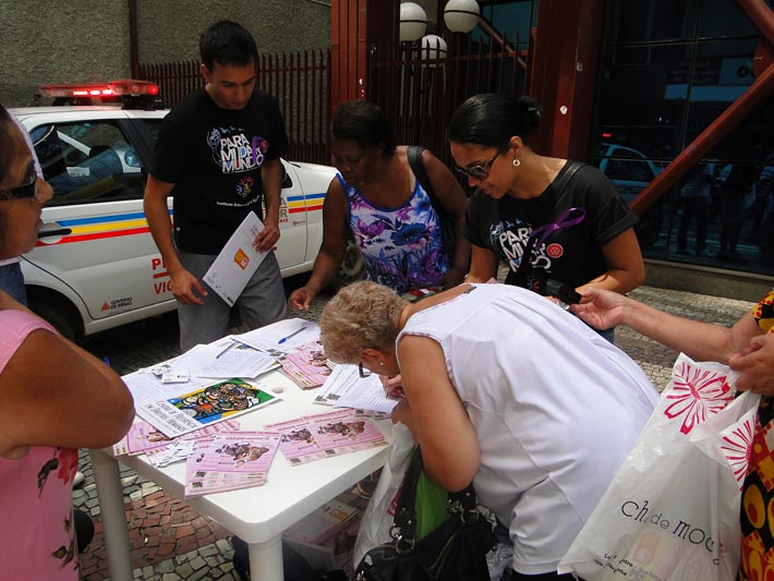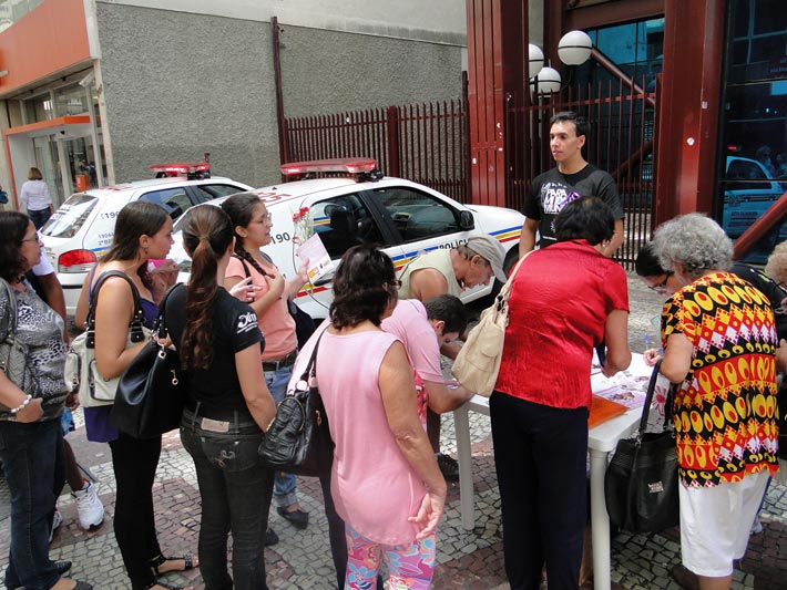 Distribuição de brindes e cartilhas, além de encenação teatral e coleta de assinaturas foram destaques do evento no Calçadão da Halfeld