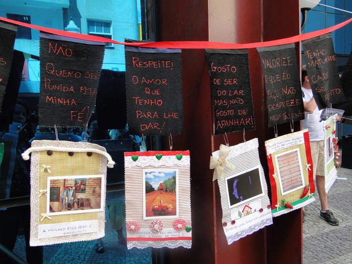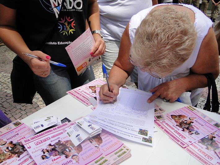 A programação contou com a distribuição de rosas, mudas, cartilhas, além de vários abaixo-assinados, promovidos pelo Centro de Referência em Direitos Humanos de Juiz de Fora e Zona da Mata. "Estamos recolhendo assinaturas para tentar implantar alguns projetos e reabrir locais que amparam as mulheres, como a Casa Abrigo e o Centro de Referência para a Mulher," destaca a assistente social, Raphaela Receputi, afirmando, ainda, que um levantamento realizado pelo centro de referência constatou que cerca de 800 crianças necessitam de creche em Juiz de Fora. "Precisamos além de combater a violência, buscar políticas públicas que atendam ao público feminino, como a construção de creches, por exemplo."