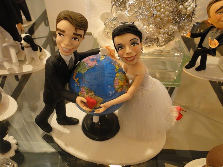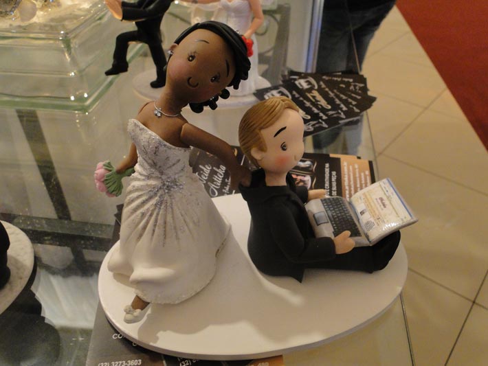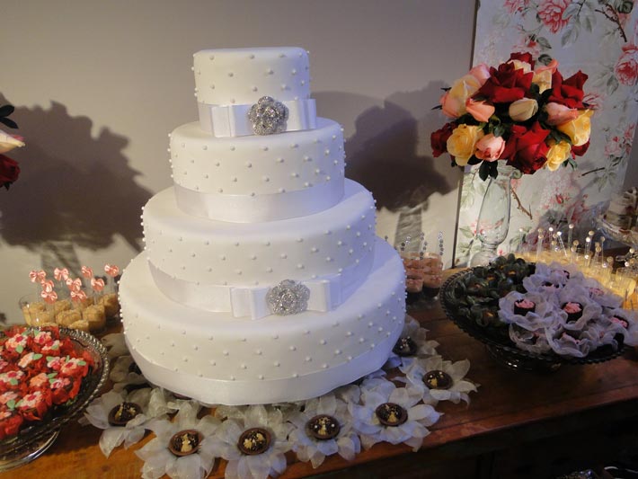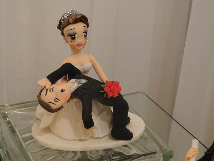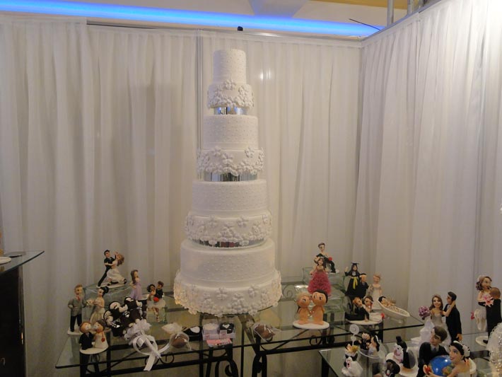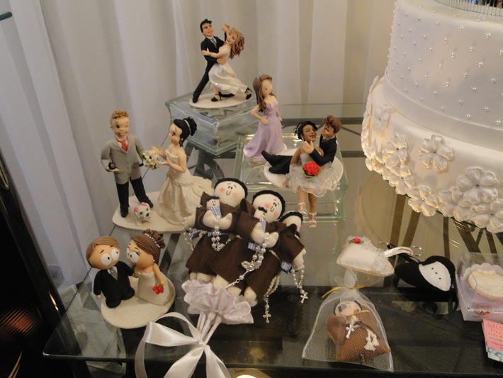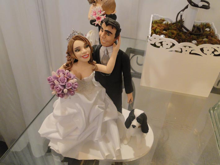 Item indispensável em qualquer festa, os bolos também ganham uma aparência especial, principalmente nos enfeites de topo. Para a artesã Neide Abreu, da empresa Neide ArtTeka, este ornamento agora não se restringe apenas aos noivos. "É muito comum o casal optar por colocar também seu animal de estimação. E não tem limite, pode ser cachorro, gato, cavalo."