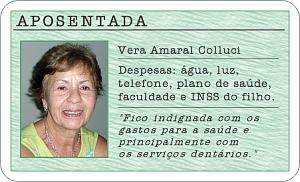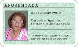 J? a pensionista, Nilva Ara?jo Porto (foto abaixo), sente-se privilegiada com o que ganha, no entanto mostra-se consciente com a real condi??o do aposentado no Brasil. "Tenho condi?es de arcar com todas as minhas despesas, mas sei que muitos aposentados est?o deixando de lado medicamentos e alimenta??o saud?vel porque n?o t?m recursos", diz.