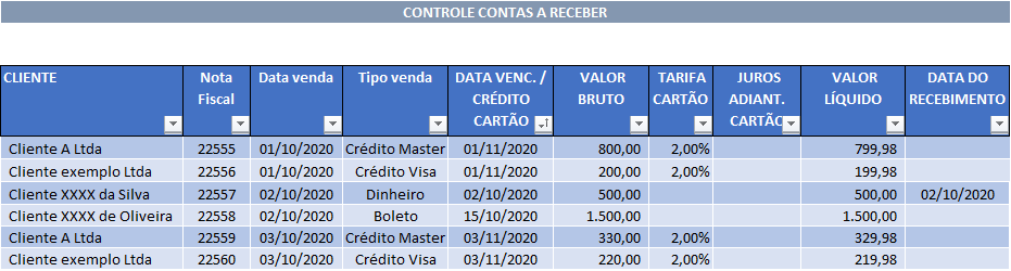 O Controle de Contas a Receber poderá ser realizado em um software da empresa ou em uma planilha eletrônica como, por exemplo, o Excel que possibilitará a fácil localização de informações.