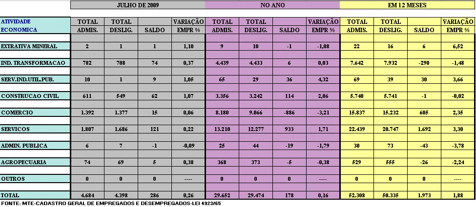 No mês de julho, 286 novas vagas de trabalho foram criadas na cidade. O maior aumento foi registrado no setor de serviços, que admitiu 1.807 funcionários e demitiu 1.686, ficando com saldo positivo de 121 postos. O saldo ficou favorável em outros sete setores de atividades na cidade. Os destaques são para a indústria da transformação (74), construção civil (62) e comércio (15). Apenas a administração pública apresentou saldo negativo, perdendo um posto de trabalho.