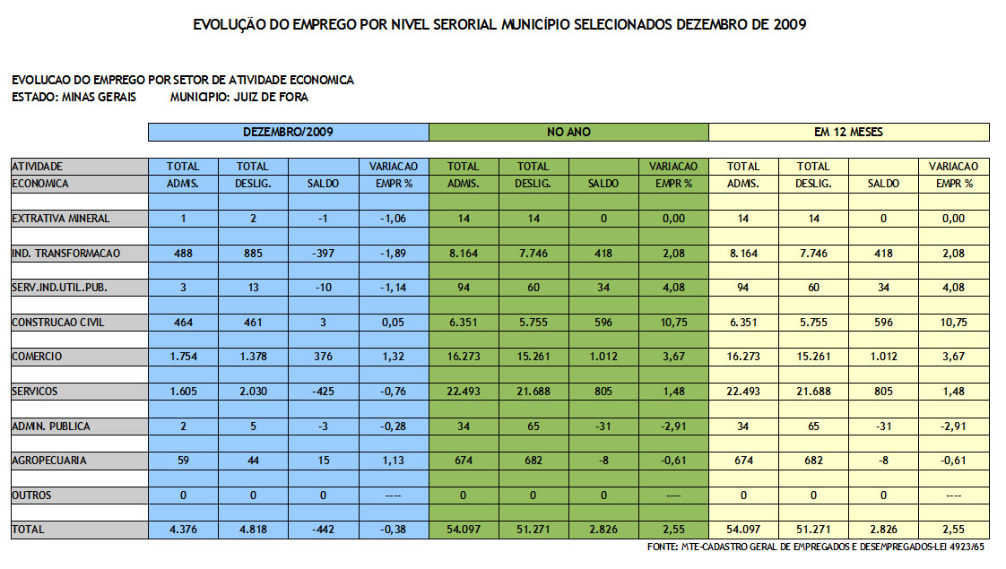 Ao longo de 2009, Juiz de Fora foi responsável pela geração de 2.826 postos de trabalho, entre os quase um milhão criados no Brasil. Além dos setores de comércio e serviços, os ramos da construção civil e da indústria da transformação contribuíram para o saldo positivo. De acordo com Nascimento, a expectativa para a indústria em 2010 é de que a geração de empregos seja duas vezes maior do que a registrada em 2009.