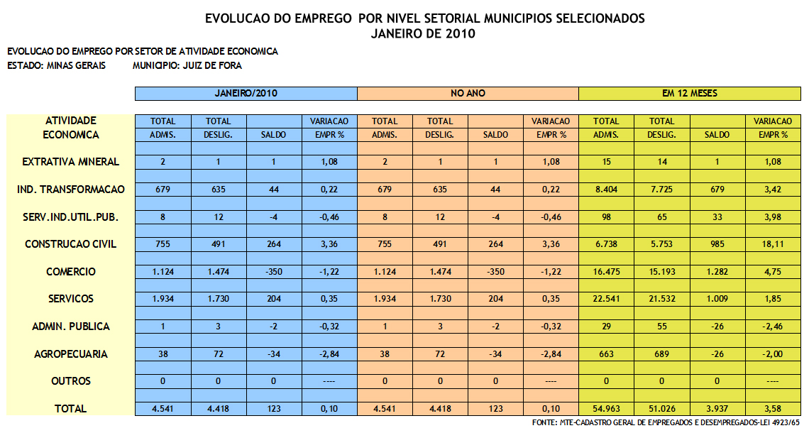 A empregabilidade no setor da agropecuária em Juiz de Fora causa grande preocupação. Segundo dados do Estudo de Evolução do Emprego, realizado pelo Cadastro Geral de Empregados e Desempregados (Caged) do Ministério do Trabalho (MTE), divulgados nesta quinta-feira, 18 de fevereiro, a agropecuária perdeu 34 postos de trabalho só no mês de janeiro de 2010. No segundo semestre de 2009, o setor perdeu 32 postos.