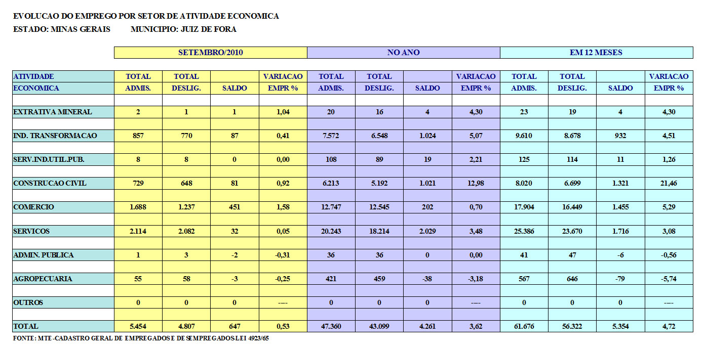 De janeiro a setembro, foram criadas 4.261 novos postos de trabalho em Juiz de Fora. O setor de serviços lidera a geração de empregos ao longo do ano, com saldo de 2.029 de saldo. No mesmo período, a indústria gerou 1.024 vagas, enquanto a construção civil criou 1.021 empregos. Por outro lado, a agropecuária perdeu 38 postos de trabalho na cidade de janeiro a setembro.