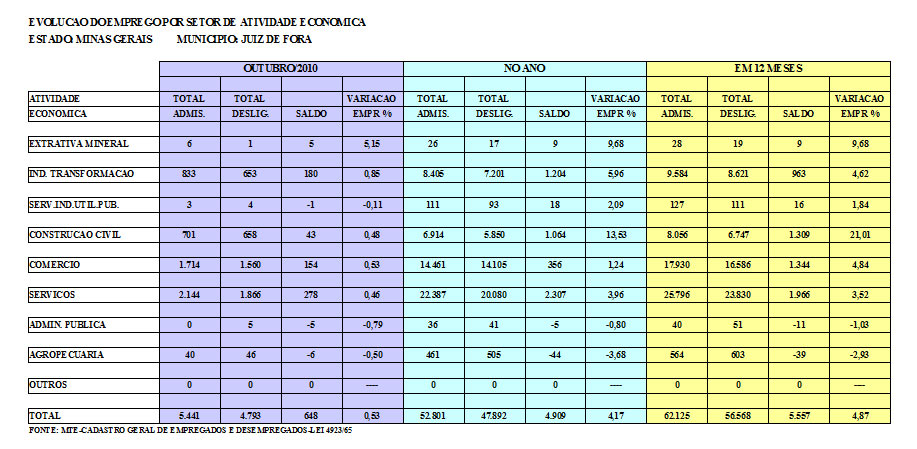 De janeiro a outubro de 2010, Juiz de Fora ganhou 4.909 novas vagas de empregos. Em Minas Gerais, ao longo deste ano, foram criados 298.143 postos, sendo 14.516 em outubro. No Brasil, o saldo entre admissões e desligamentos foi de 204.804 em outubro e de 2.406.210 desde o início do ano.