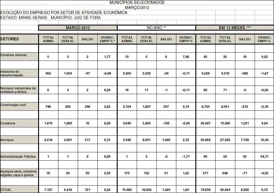 No mês de março em Juiz de Fora foram criados 721 novos postos de trabalho, o que representa 683 empregos a mais do que no mesmo mês em 2011, quando foram gerados apenas 38 novas vagas. O saldo positivo representa para o município o crescimento de 94,72%.