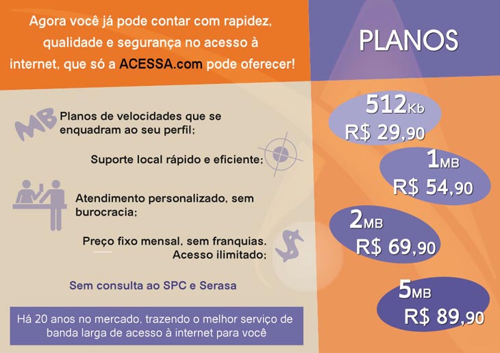 Raíza ainda complementa que a ACESSA.com oferece diversas formas de pagamento aos seus clientes. "Pode ser feito na loja, por boleto, por débito automático na Caixa Econômica Federal e no Banco do Brasil, aceitamos também cartões de crédito de Visa e MasterCard. Caso o cliente prefira, ele pode fazer o pagamento por depósito todos os meses, enviando o comprovante de pagamento por e-mail, ou fazer com um cheque à vista. O cliente tem um leque de escolhas", diz.