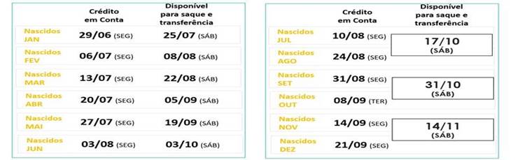 O calendário foi estabelecido com base no mês de nascimento do trabalhador e contém dados que correspondem a valores de crédito na conta de armazenamento digital social, quando os recursos podem ser usados em estatísticas eletrônicas, além de dados a partir de quando os recursos disponíveis estão disponíveis para saque em espécie ou transferência para outras contas.