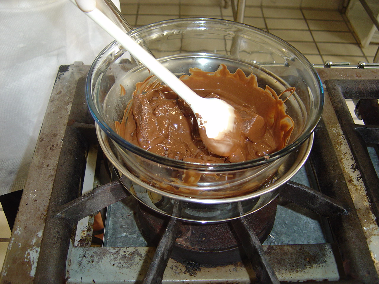 • Leve dois ter?os do chocolate picado ao fogo em banho-maria, at? que o chocolate atinja a temperatura de 45 graus, o seu ponto de derretimento.