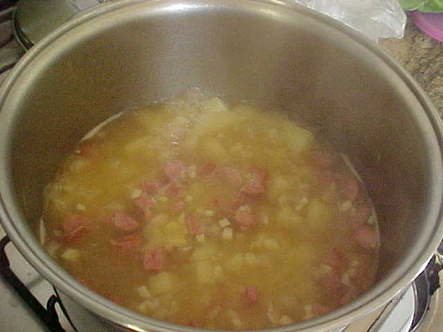 A receita leva batata, ling?i?a calabresa, ervilha, creme ou sopa de cebola, cebolas picadas, alhos amassados e pimenta ? gosto. O detalhe ? que Sebasti?o diz que n?o pode ficar muito cremoso. Apesar de Haline preferir sopas mais encorpadas, ela segue as recomenda?es do marido.