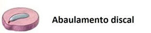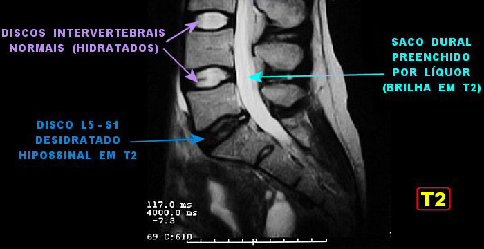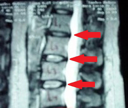Protrusões dos discos entre as vértebras Lombares 1 e 2; 2 e 3; 3 e 4, marcados pelas setas. Em branco, o saco dural, preenchido de líquor (onde estão os nervos finais da medula espinhal, "embebidos" em um líquido chamado líquor). Neste estágio, já começa a haver certa compressão com alguns sintomas.