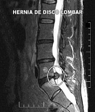 Hérnia de disco lombar circulada, entre Lombar 5 e Sacral 1. No disco acima, temos uma protrusão discal, estágio anterior à formação da hérnia.
