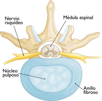 A presença do disco suaviza e permite o movimento perfeito entre as vértebras, sem gerar atrito entre elas. O disco vertebral é composto por anéis fibrosos (aspecto semelhante ao cortar uma cebola ao meio) que envolvem uma "bolinha", chamada núcleo pulposo.