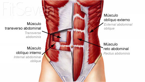 Por cima do peritônio, vêm três camadas musculares abdominais. O transverso abdominal (mais profundo), depois o reto abdominal e o oblíquo interno como segunda camada e por cima o músculo oblíquo externo, com reforço das fáscias (lâmina ou faixa larga de tecido conjuntivo fibroso, que, abaixo da pele, circunda os músculos e outros órgãos do corpo). E, por cima, vem nossa pele (também composta de várias camadas).