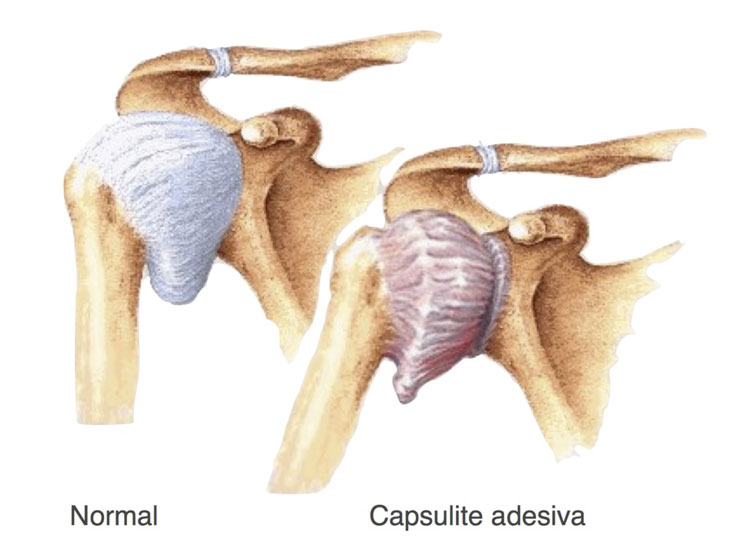 Na capsulite adesiva, existe uma inflamação desta cápsula, que se "enruga", diminui de tamanho e fica mais rígida. Ela causa dor, seguida de limitação dos movimentos normais do ombro.