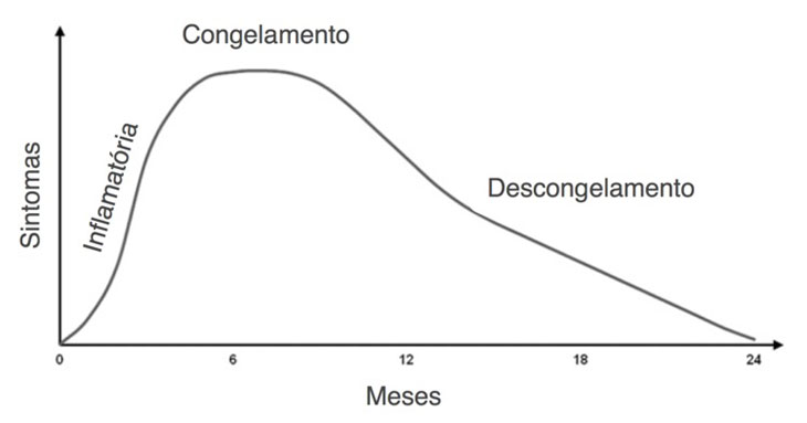 3) Fase de descongelamento: esta tem uma duração variável. O movimento do ombro melhora progressivamente, desaparecendo a doença. Na maioria dos casos o paciente pode ficar com alguma seqüela de perda de alguns graus de movimentação do ombro.