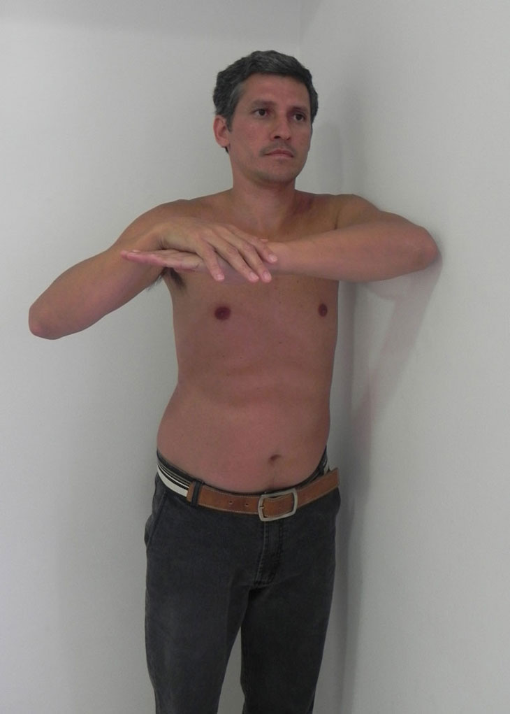 Posição 1 para alongamento da cápsula: De pé, encostado de lado na parede e com cotovelo na altura do ombro, empurra-se o punho para baixo