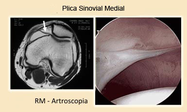 No exemplo acima, a plica sinovial medial inflamada. Pode ser confundida com lesão de menisco.