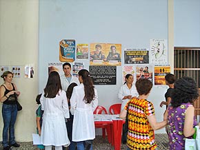 Nas mesas montadas no corredor da galeria, os estudantes distribuem panfletos informativos