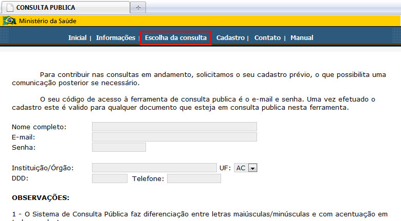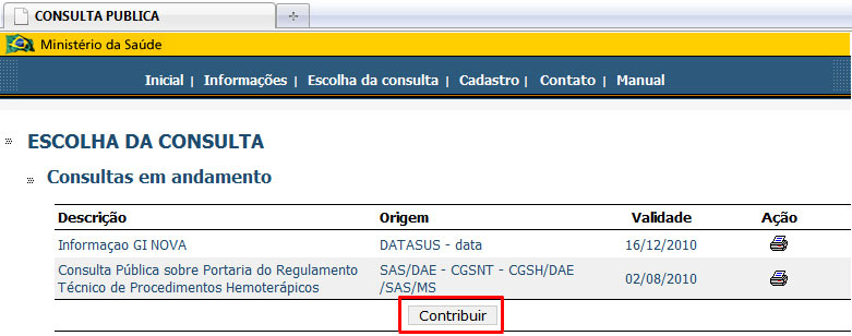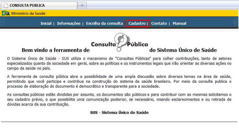Para responder à enquete, o usuário deve acessar o link do Ministério da Saúde e efetuar o cadastro no campo Cadastro. Após, deve clicar em Escolha da Consulta e selecionar a opção Contribuir, no campo referente à Consulta Pública sobre Portaria do Regulamento Técnico de Procedimentos Hemoterápicos. Confira abaixo o roteiro passo a passo.