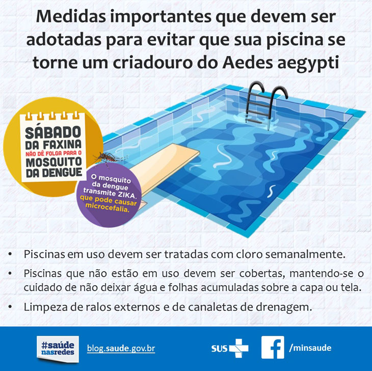 Outra preocupação constante da população é para quem possuí piscina em casa. Com a crise hídrica, retirar a água não é o mais indicado. "Existem alguns produtos que fazem o tratamento por vários dias. Se não, tampar a piscina com tela, já que a lona também pode acumular água. O ideal mesmo são os produtos químicos", afirma.