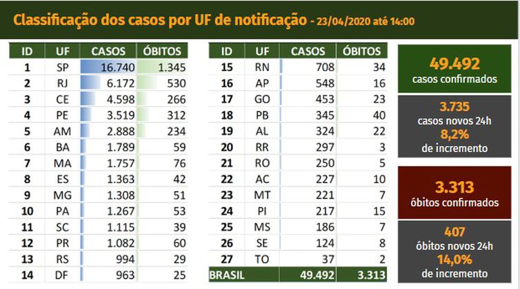 O Brasil teve 407 novas mortes nas últimas 24 horas em razão da pandemia do novo coronavírus (covid-19), o maior número neste período desde o início da contagem. No total, o país soma 3.313 óbitos, 49.492 casos confirmados da doença e 26.573 pacientes recuperados. Ainda de acordo com os dados divulgados hoje (23) pelo Ministério da Saúde, 19.606 casos estão em acompanhamento.