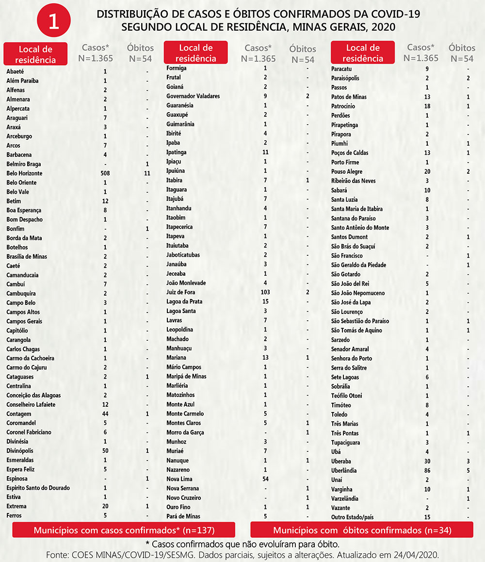 Até o momento, em Minas Gerais são 1.419 casos confirmados, 91 óbitos em investigação, 330 óbitos descartados e 54 óbitos foram confirmados. Na última quinta-feira, o estado tinha 51 óbitos confirmados por coronavírus,1.308 casos confirmados, 85 óbitos em investigação e 326 descartados. Com isso, em menos de 24h, o estado teve mais três mortes e 11 casos confirmados.