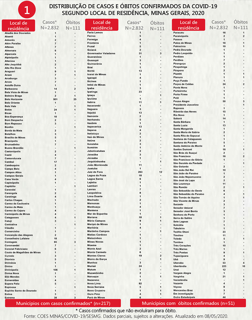 Em Minas Gerais já são 2.943 casos confirmados, 140 óbitos estão em investigação, 477 óbitos descartados e 111 óbitos foram confirmados. Belo Horizonte continua na liderando a lista com 901 casos e 25 mortes. Em segundo lugar aparece Juiz de Fora, seguida de Uberlândia com 233 casos confirmados e dez mortes.
