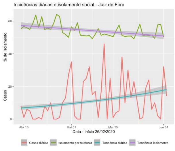 O quarto boletim semanal do grupo de modelagem epidemiológica da Covid-19, formado por pesquisadores da Universidade Federal de Juiz de Fora (UFJF) foi divulgado nesta quarta-feira, 3 de junho. Os dados reiteram a continuidade da queda de isolamento social e a permanência do crescimento da curva de casos do novo coronavírus no município.