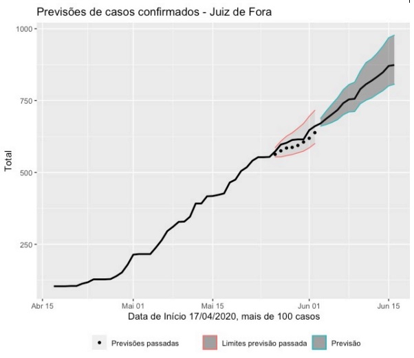 De acordo com o documento divulgado, a previsão de casos confirmados em Juiz de Fora para o dia 8 de junho, antes em 719, foi reajustada para 754 (ainda dentro dos intervalos de previsão), podendo chegar a 874 casos no dia 16 de junho.