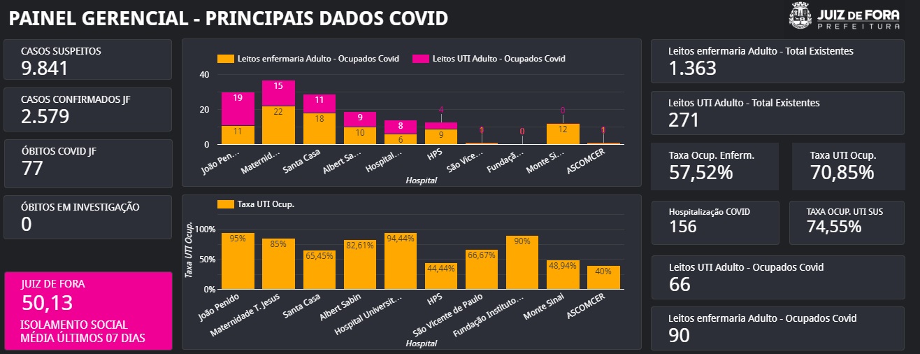A taxa de ocupação dos leitos de UTI do Sistema Único de Saúde (SUS), em Juiz de Fora, está em 74,55% nesta sexta-feira, 10 de julho. Já a soma de leitos de UTI públicos e privados têm taxa de ocupação de 70,85%, e a ocupação de leitos de Enfermaria chegou a 57,52%. A média do isolamento social no município, dos últimos sete dias, está em 50,13.