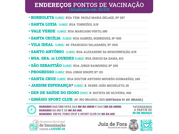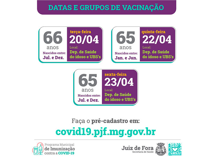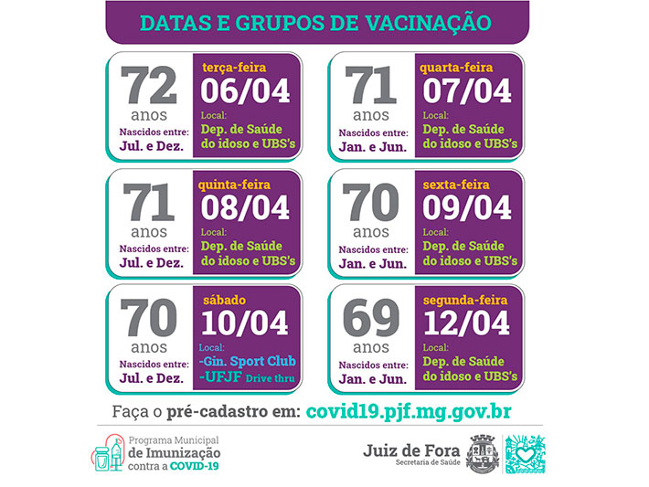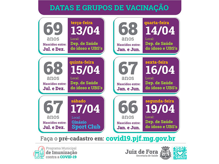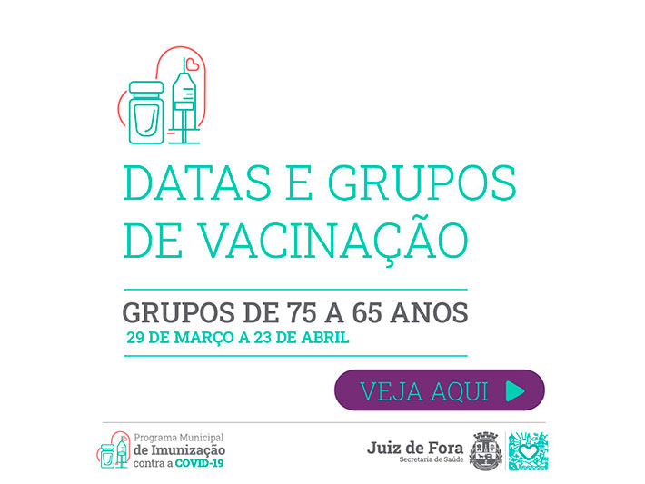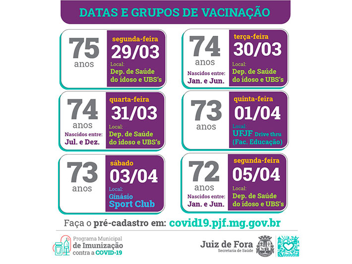 O novo grupo contempla pessoas de 65 a 75 anos. Confira na tabela, abaixo, as idades e os locais de vacinação. O horário permanece o mesmo: das 8h às 10h30 e de 13h às 16h30, exceto às quinta-feiras. No drive-thru da UFJF, continua das 9h às 16h.