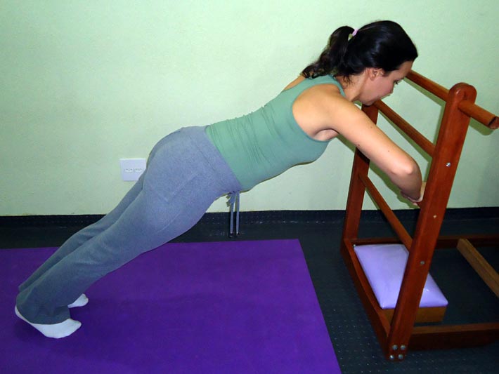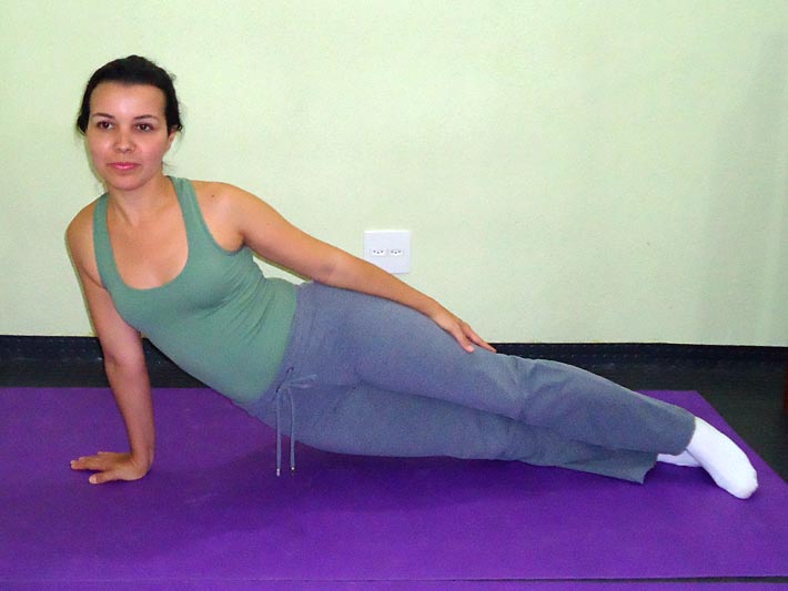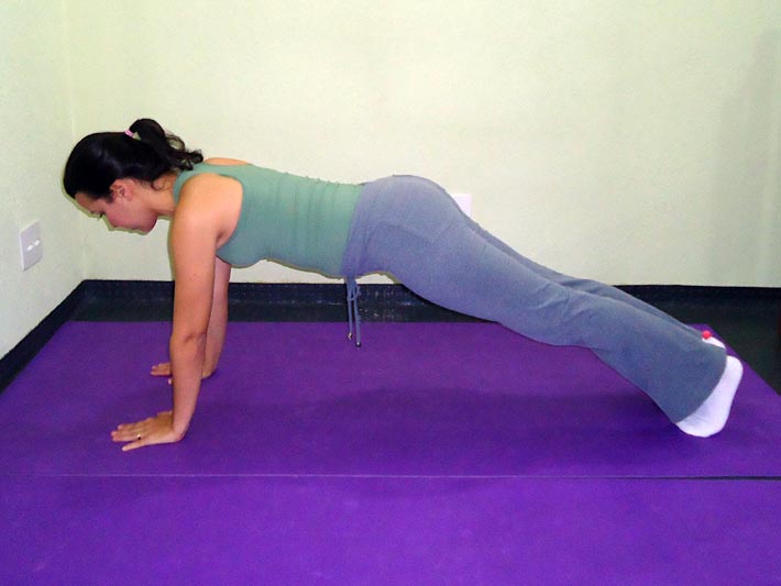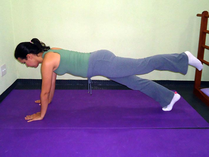 - Com as mãos e os pés apoiados no chão, flexione os braços descendo o corpo. Tome cuidado para não elevar o bumbum;