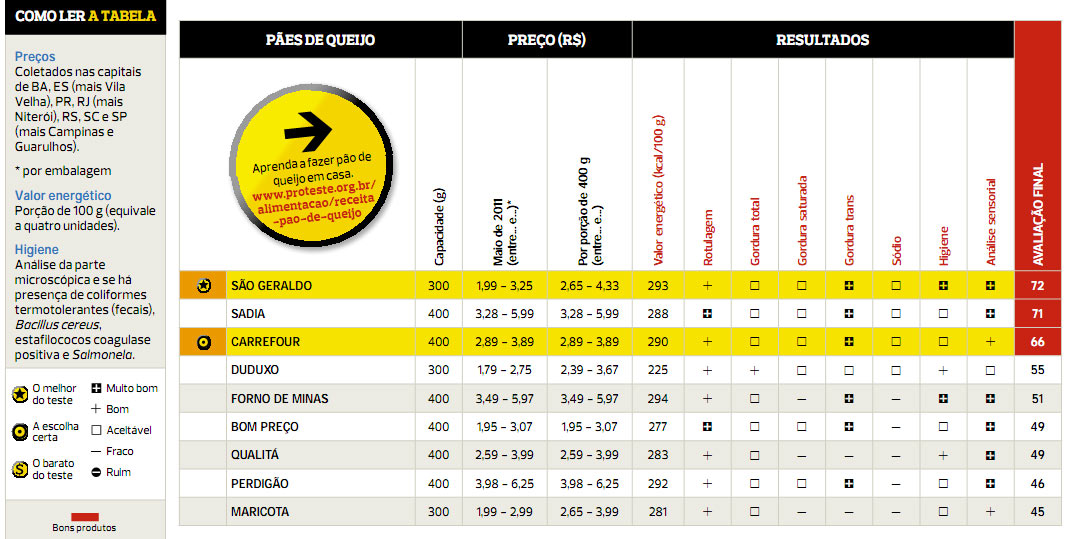Uma pesquisa realizada pela Associação Brasileira de Defesa do Consumidor (ProTeste), com nove marcas de pães de queijo, detectou elevados teores das duas substâncias. O teor de sódio nos produtos testados variou de 0,5 g a 0,8 g para cada 100 g.
