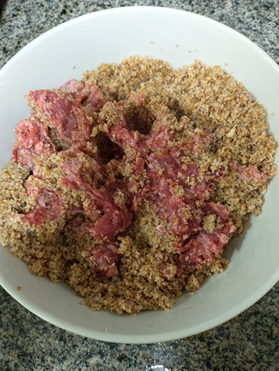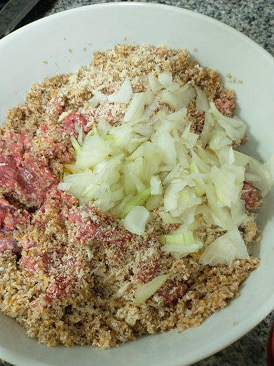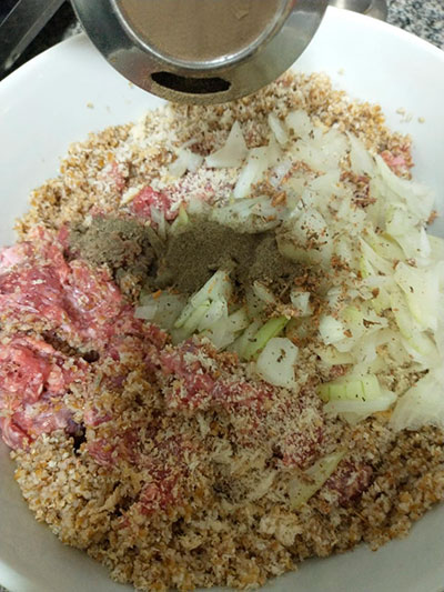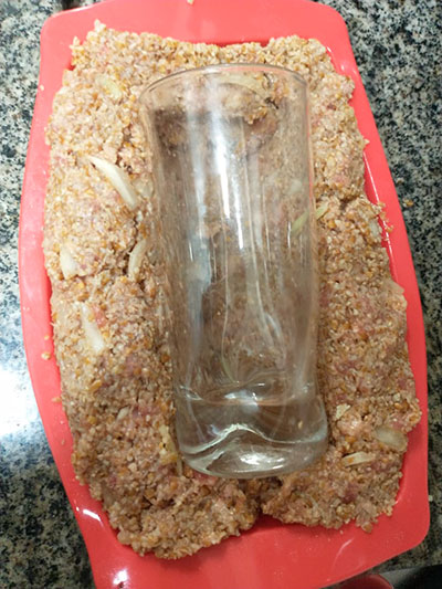 1. Misture o trigo de quibe com a carne e os outros ingredientes. Coloque tudo em uma forma untada e pressione um copo no meio do bolo de carne.