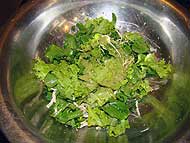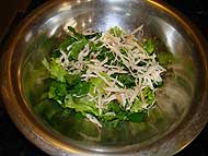 Ainda na vasilha, mistura-se o cheiro verde e o frango. A pessoa deve utilizar as mãos para misturar os ingredientes. Após a mistura, deve-se inserir o orégano e o manjericão. Para o frango ser posto na mistura, ele deve estar desfiado em pedaços bem pequenos. O quinto passo é o molho. Os ingredientes do molho especial são: azeite, vinagre, limão, ervas finas e sal.