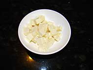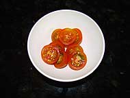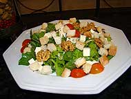 Na segunda etapa, a mistura deve ser posta em um prato para ter início a decoração da salada. O queijo minas deve ser cortado em cubos de tamanho médio, o tomate cereja, fatiado de maneira fina e as nozes colocadas inteiras. Por fim, adiciona-se as torradinhas de pão.