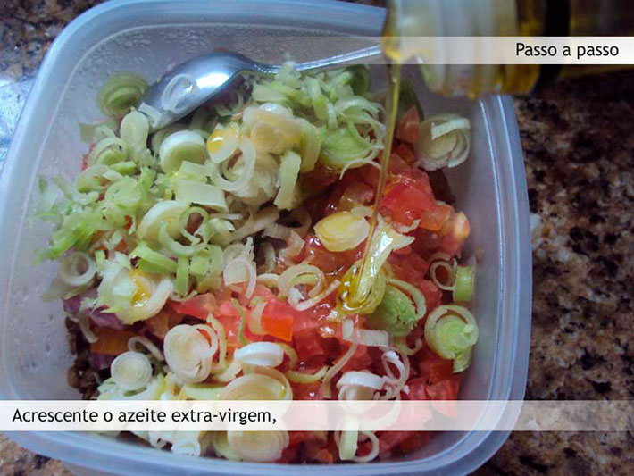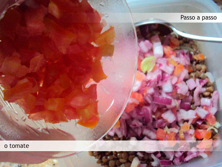 Em uma tigela, coloque a lentilha já cozida. Acrescente a cebola roxa, o tomate e o alho poro e mexa bem. Acrescente o azeite extra-virgem, o sal e a páprica doce. Para finalizar, tempere com limão, misture e leve a geladeira até a hora de servir.