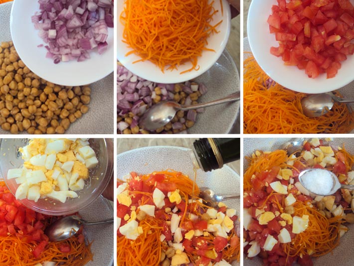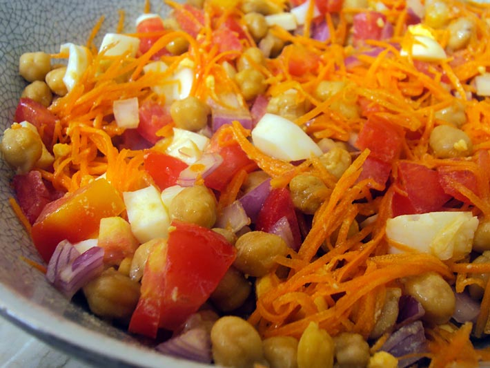 1 xícara de grão de bico 1 cenoura ralada 2 tomates em cubos e sem semente 1 cebola roxa em cubos 2 ovos cozidos e picados Azeite a gosto Sal a gosto Cozinhe o grão de bico em uma panela de pressão por 20 minutos e escorra. Misture todos os ingredientes e leve à geladeira. Sirva em seguida