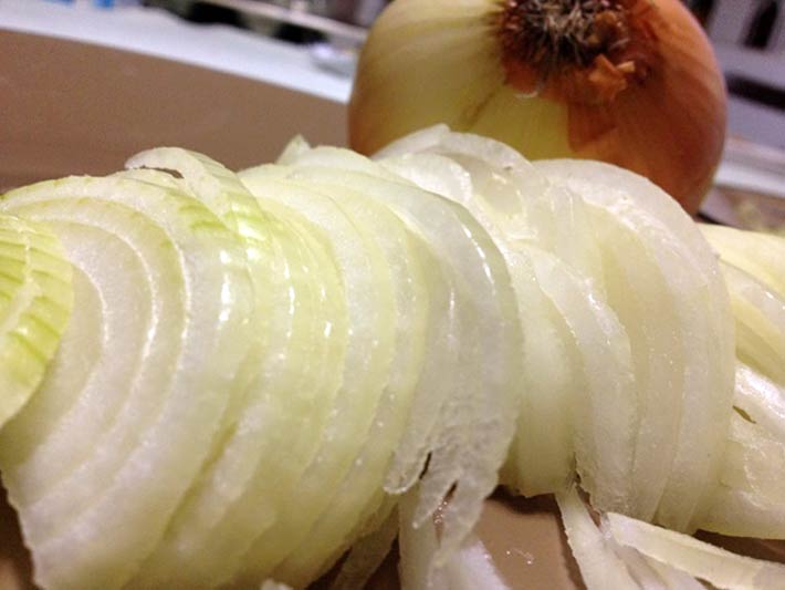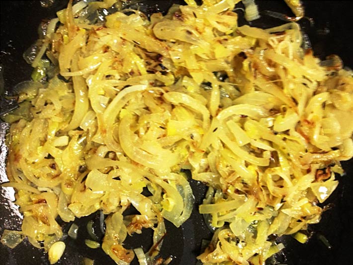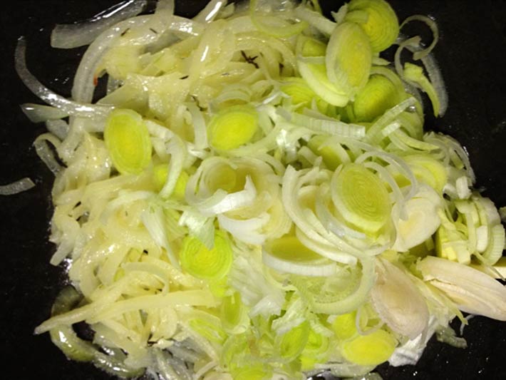 Faça uma bola de massa, envolva em plástico e deixe na geladeira, por pelo menos 15 minutos. Enquanto isso, pré-aqueça o forno a 180oC e vá preparando o recheio. Corte uma cebola grande em rodelas finas. Faça o mesmo com a parte mais branca do alho poró, depois de lavado.