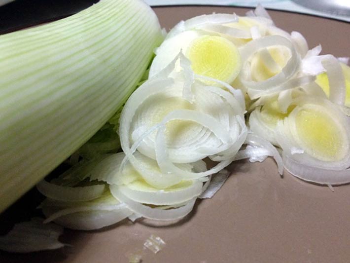 DICA: A parte verde mais escura e bem fibrosa, pode ser usada para fazer um caldo de legumes, se você não quiser jogar fora.