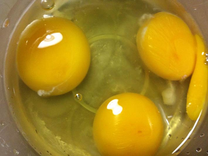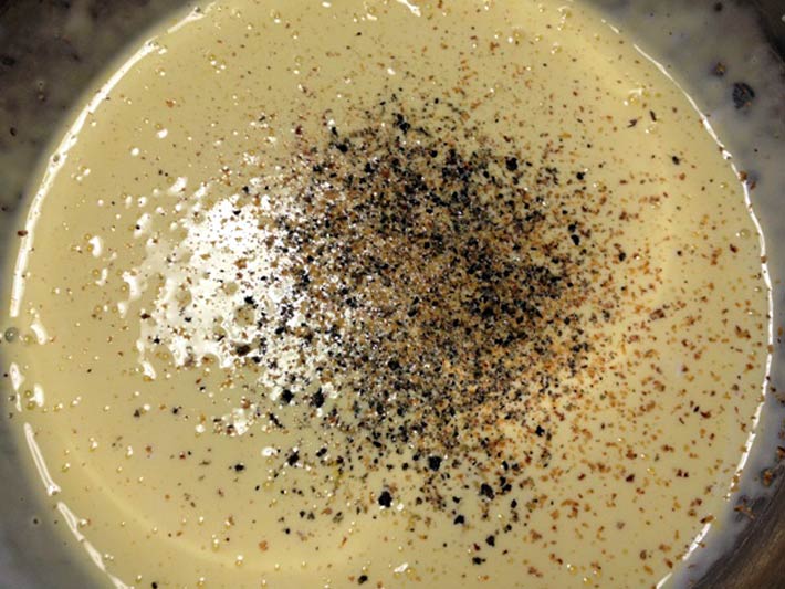 Fazer o creme de ovos é muito simples: bata três ovos com 300 ml de creme de leite. Depois adicione pimenta do reino, sal e noz moscada a gosto. Reserve.
