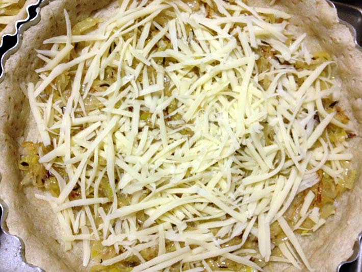 Derreta duas colheres de manteiga em uma panela e, com ½ colher de sopa de tomilho desidratado, cozinhe a cebola até ficar macia. Adicione o alho poró e cozinhe por 10 minutos. Reserve. Rale uma xícara daquele queijo esquecido na geladeira. Pode ser muçarela, parmesão, prato, gruyère ou um pouco de cada. Em seguida, tire a massa da geladeira e forre uma forma, preferencialmente, de fundo removível. Leve para assar por 10 minutos ou até que as bordas fiquem levemente douradas.