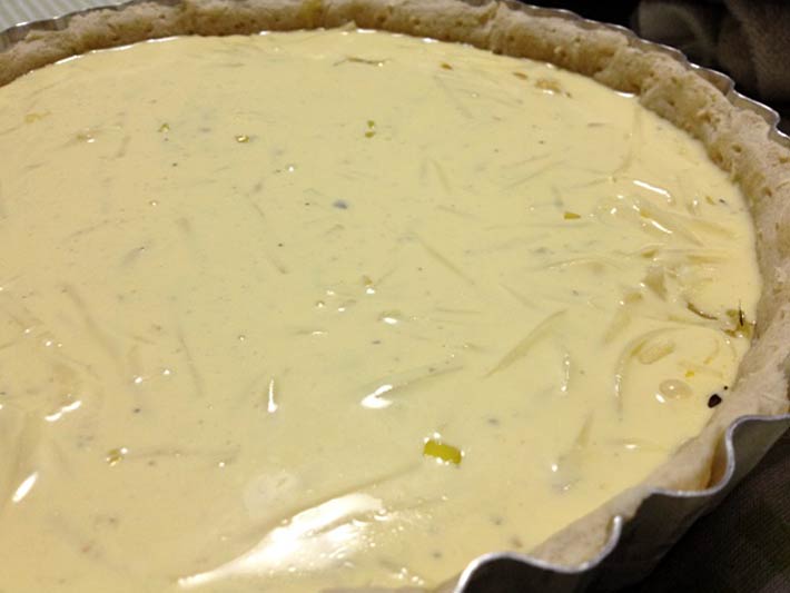 Retire a massa do forno e, por cima, coloque o recheio (alho poró e cebola), polvilhe o queijo e despeje o creme de ovos. Agora é só levar tudo ao forno por 20 minutos. Fica ótimo com uma salada de folhas e tomates. Aproveite e bom apetite!