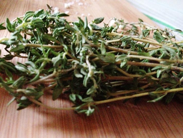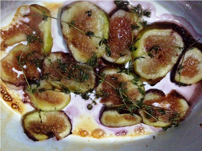 Vamos começar preparando os figos. Eu utilizo a proporção de meio figo para cada tortilha. Se você gostar muito, use mais, mas essa quantidade funciona. Corte os figos em seis fatias médias e disponha em um refratário. Por cima, distribua ramos de tomilho fresco e duas colheres de sopa de mel. Reserve.