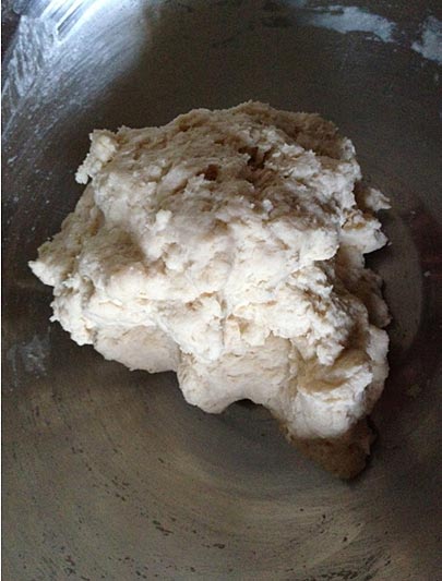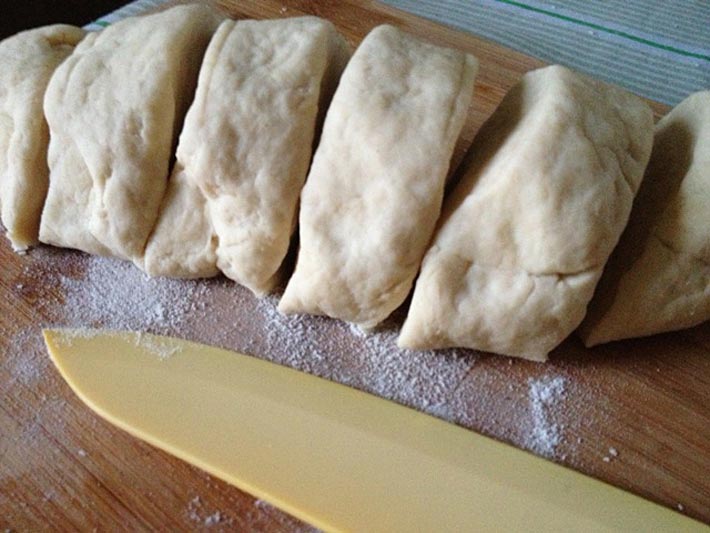 A massa deve desgrudar fácil da mão sem nem precisar sovar muito. É bem rápido. Se estiver grudando, a quantidade de água utilizada foi maior que a necessária. Acerte com mais farinha. Divida a massa em seis partes e, com um rolo, abra em discos. Faça o mais fino que puder, sem quebrar a massa. Como tem fermento, ela vai adquirir uma espessura maior depois.
