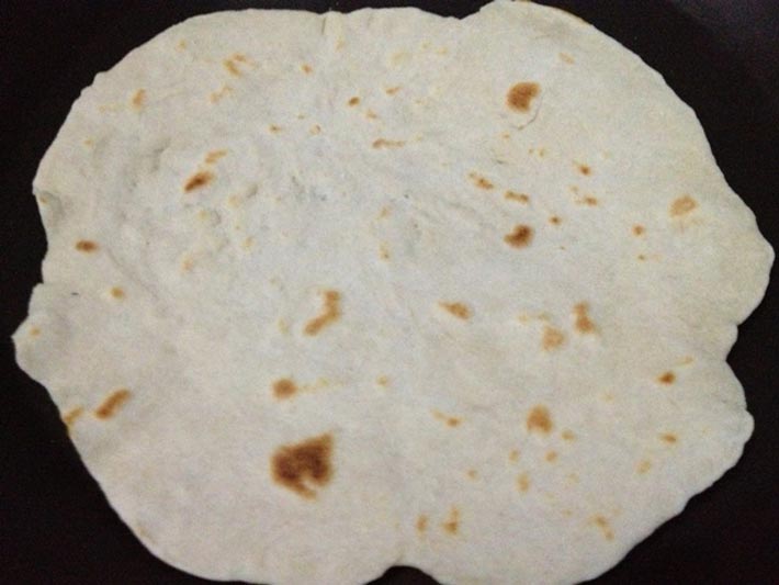 Enquanto você vai abrindo os discos, pré-aqueça uma frigideira em fogo médio alto e vá colocando, um a um, os que já estão prontos. Depois de cozinhar um lado por mais ou menos um minuto, vire e cozinhe o lado oposto. Quando a tortilha começar a formar bolhas de ar, aperte suavemente para liberar o ar. Não aperte muito.